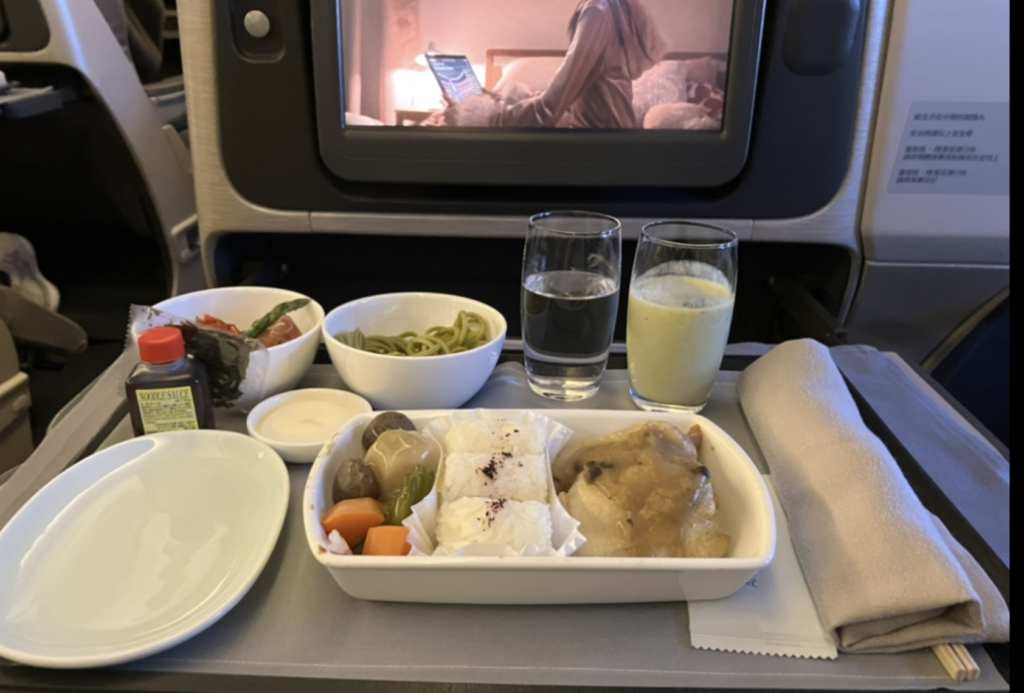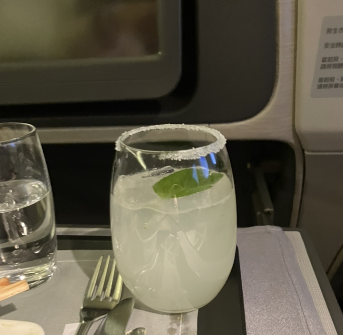 お楽しみの機内食は、期待以上のボリュームとクオリティでした。搭乗前のラウンジですでにお酒を嗜んでいましたが、機内でもシャンパン、ワイン、そしてカクテルと、ついつい手が伸びてしまいます。空の上でいただく一杯は、どうしてこんなに格別なのでしょうか。