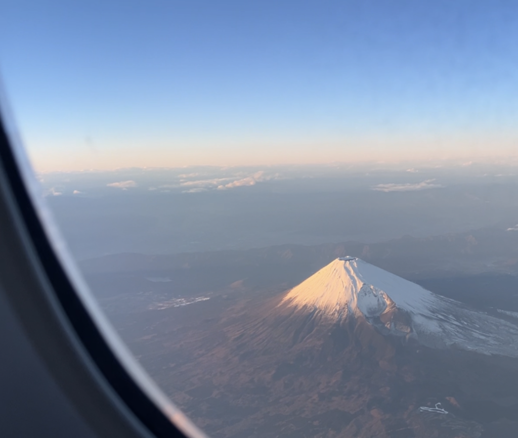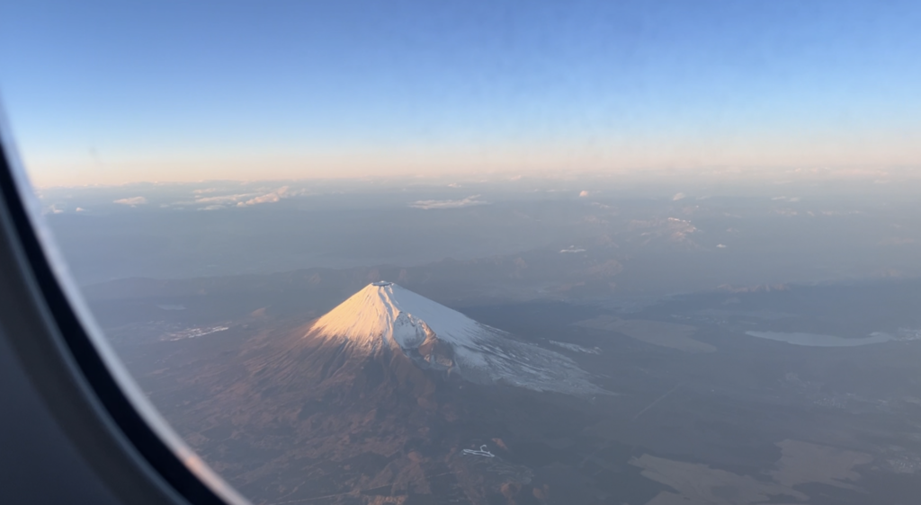 フライト中、最も感動したのが窓の外の景色です。雄大な富士山がくっきりと姿を現しました。機長さんからも直々にアナウンスが入るほどの絶景。 私は窓側の席だったのですが、反対側の席の方々もその美しさに引き寄せられるように集まってきました。自然と「どうぞどうぞ、ここから綺麗に見えますよ」と場所を譲り合う空気が生まれ、機内は一気に和やかな雰囲気に。素晴らしい景色を共有することで、見知らぬ乗客同士の心がひとつになったような、とても素敵な時間でした。